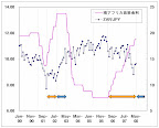 図は、南アフリカ共和国におけるその「政策金利と対円レート」の関係をグラフにしたものである。